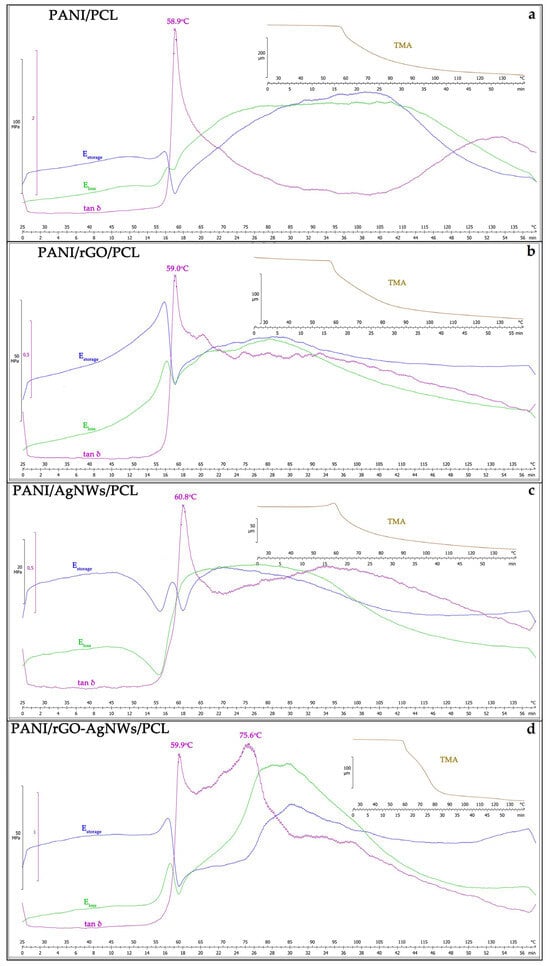 Thermomechanical analysis of synthesized film samples: PANI/PCL (a), PANI/rGO/PCL (b), PANI/AgNWs/PCL (c), and PANI/rGO–AgNWs/PCL (d).