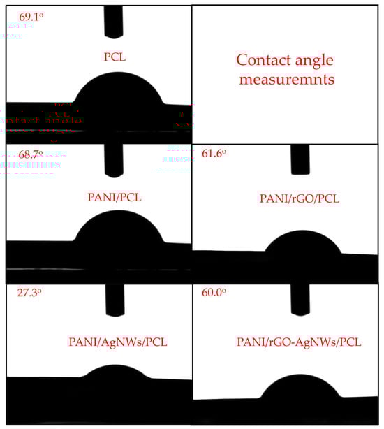 From a functional perspective, the observed trend—PANI/AgNWs/PCL < PANI/rGO–AgNWs/PCL < PANI/rGO/PCL < PANI/PCL < PCL—shows a systematic change in surface polarity and energy as conductive nanofillers are added.