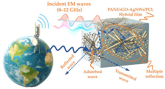 Graphical illustration of the shielding mechanism of the synthesized PANI/rGO–AgNW/PCL hybrid films.