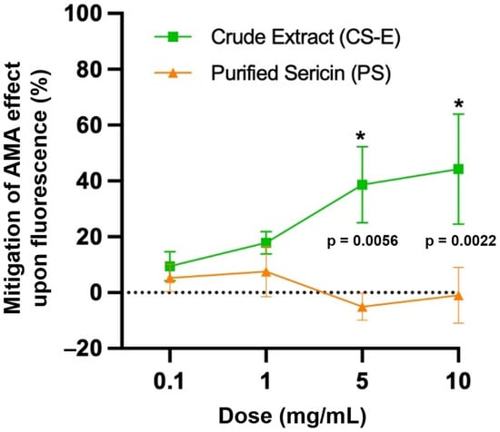 Figure 2 shows that the sericin sample CS-E significantly mitigated the pro-oxidant effect of AMA, lessening its suppressive effect on the probe’s fluorescence, at doses of 5 mg/mL (by 38.62 ± 7.86%, p = 0.0056) and 10 mg/mL (by 44.29 ± 11.40%, p = 0.0022). CS-E is an extract of crude sericin containing predominantly non-protein components. In contrast, purified sericin (sample PS) did not exhibit any mitigating action on AMA’s effect upon fluorescence, thus suggesting that PS may not meet the requirements for an antioxidant in accordance with the testing conditions.