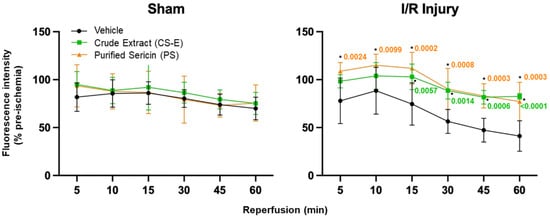 The quantification of ME-TRN fluorescence captured in vivo in the rat fundus during 60 min of reperfusion following an induced acute ischemic insult. Data are presented as changes in the fluorescence intensity at each time point as a percentage of the pre-ischemic (time zero) value (mean ± s.d.). In the non-ischemic eyes (sham), the intraperitoneal administration of sericin samples (CS-E, PS) had no effect on retinal fluorescence throughout the treatment compared to the vehicle group (p = 0.7204). An I/R injury resulted in a marked decrease in fluorescence intensity over the 60 min of reperfusion (I/R injury, vehicle). Intraperitoneal injections of any of the sericin samples (CS-E or PS), administered one hour before the ischemic insult, mitigated the decrease in retinal fluorescence intensity. Significant improvements were observed at each time point for PS (*, p < 0.05) and after 15, 30, 45, and 60 min for CS-E (●, p < 0.05), compared with I/R injury vehicle controls at each respective time point, as indicated by the inserted p-values.