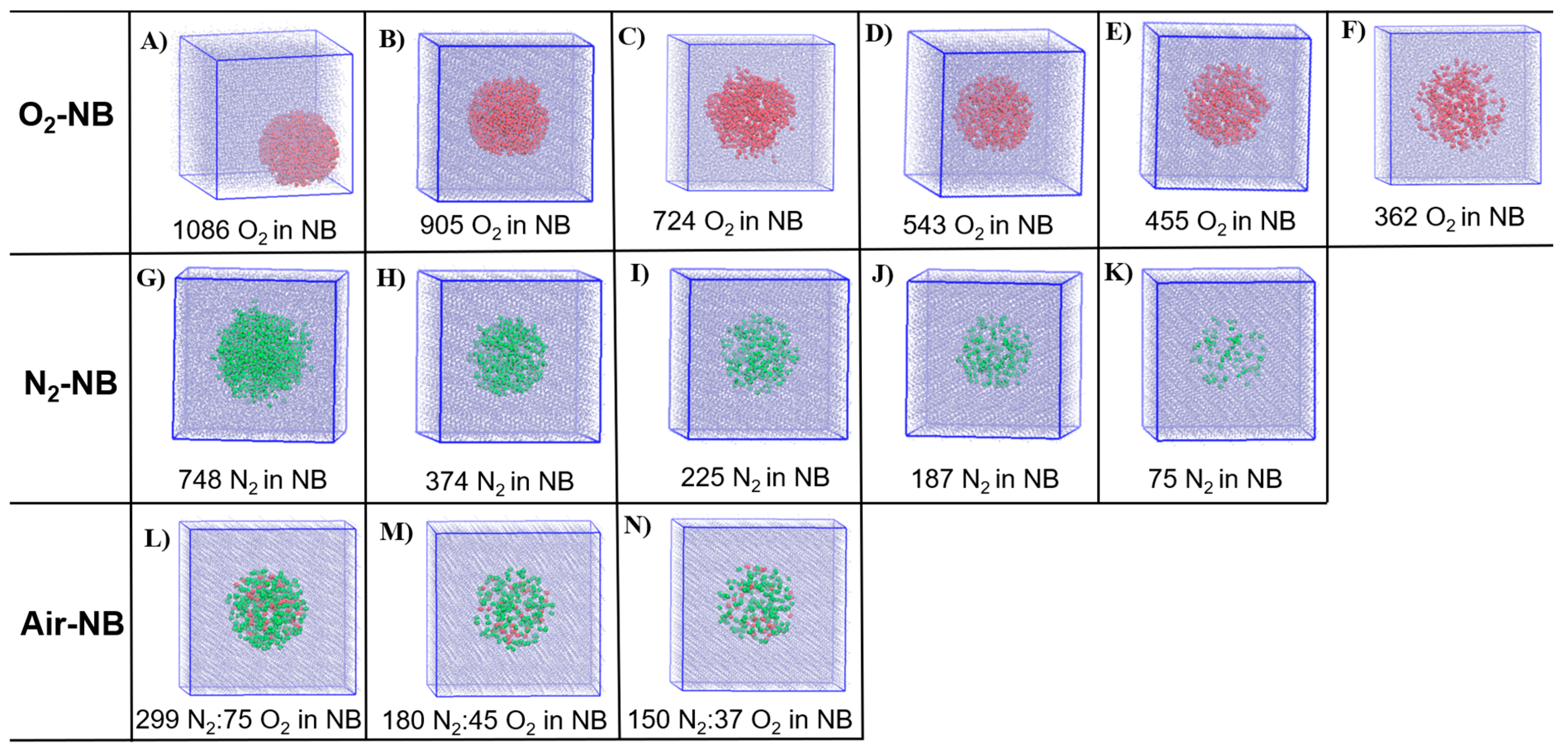 | NB-Gas Type | Number of Molecules in the Initial NB | * % of Atoms in the NB: Last 10 ns | * H-bonds Number, NB-H2O: Last 10 ns | NB Diameter (nm): Last Frame | |||