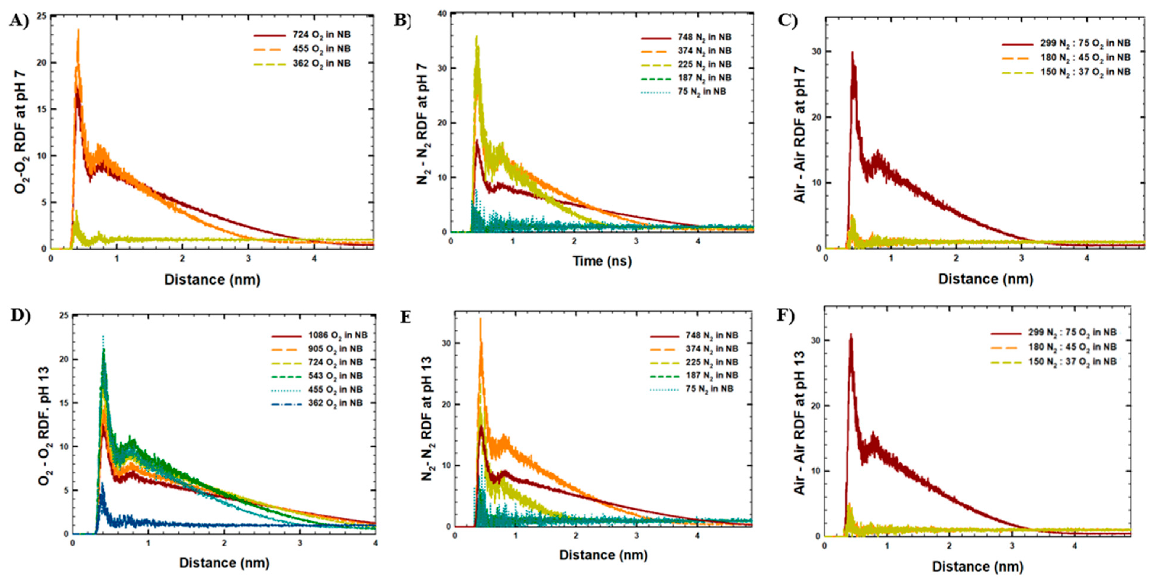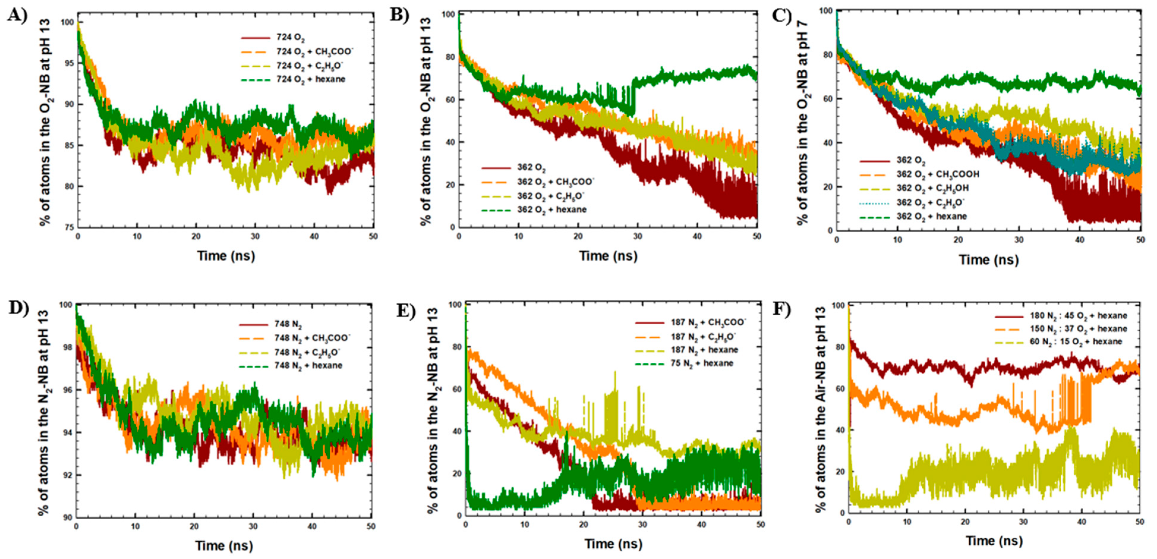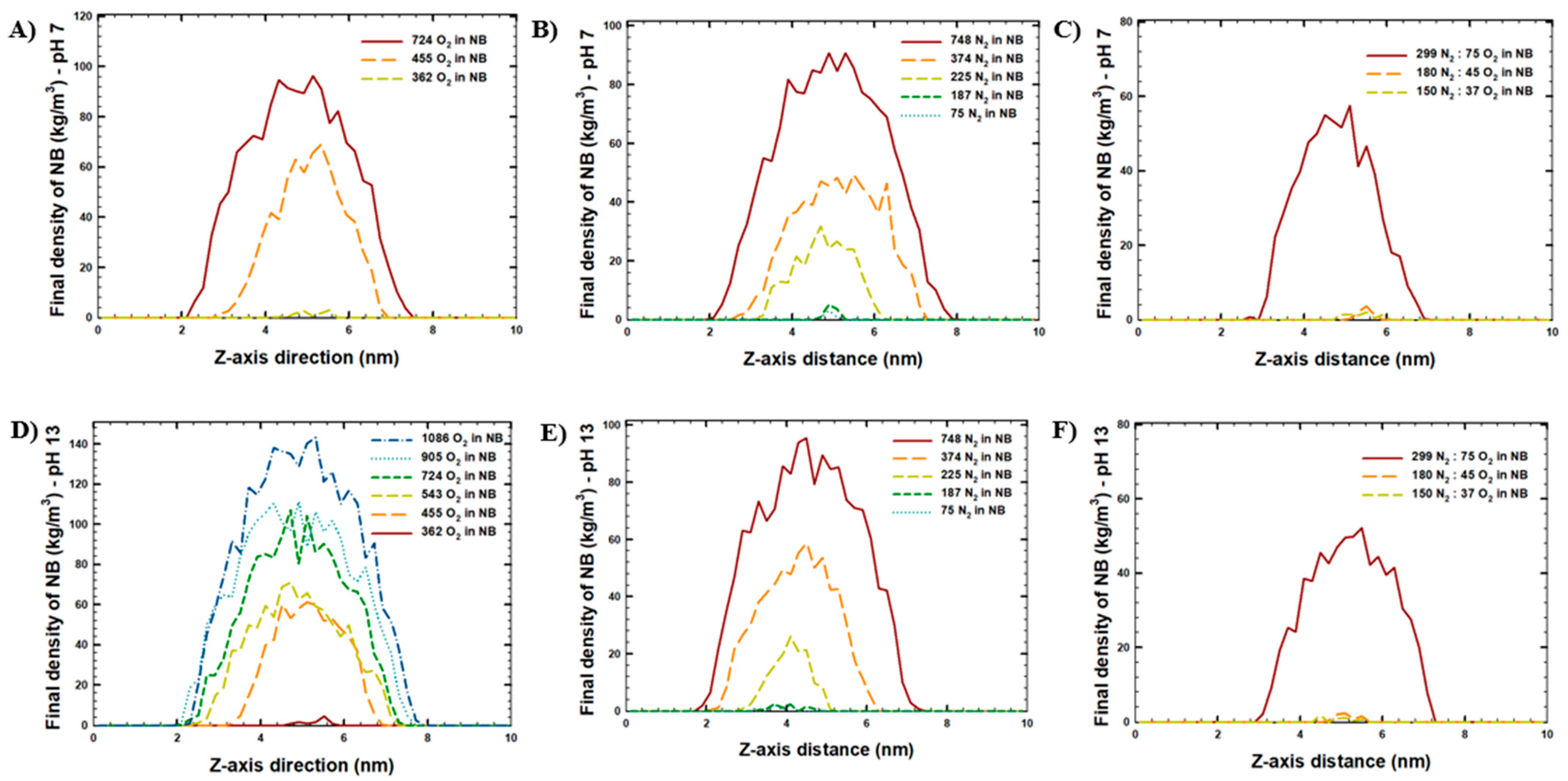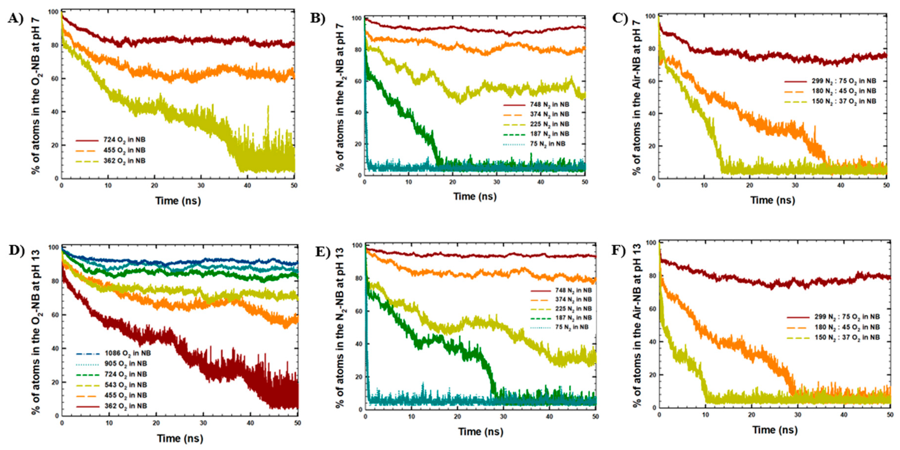 | NB-Gas Type & pH | Simulated System | % of Atoms in the NB: Last 10 ns | H-Bonds Number, NB-H2O: Last 10 ns |