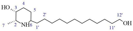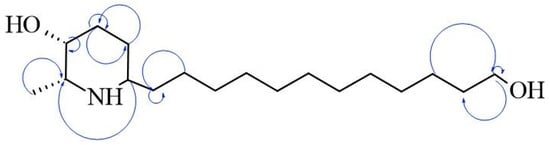 The AZS extract was fractionated via flash chromatography over Si-gel columns. The presence of alkaloids was confirmed in four of 12 fractions, and the most abundant fraction was selected for purification by chromatographic methods (see the Section 4). From this, as the alkaloid julifloridine was identified as one of the main components in the alkaloid extract (Table 2). Its structure was determined by HRESIMS (m/z 300.2895 [M + H]) and 13C and 1H NMR experiments. The results of these experiments are shown in Table 2 and Figure 6, Figure 7 and Figure 8. Two-dimensional NMR experiments helped to corroborate this structure: In COSY experiment (Figure 7), the correlations between δH 3.20 (q, J = 6.6 Hz, H-2) and δH 1.52 (m, H-7) and δ3.81 (dt, J = 3.4, 1.7 Hz, H-3) and δH 1.78 (qt, J = 8.7, 3.2 Hz, H-5a) were found and confirmed the structure of the piperidine ring. The bond between the piperidine ring and the aliphatic chain was confirmed by the correlation between δH 3.02 (tt, J = 8.7, 4.2, H-6), δH 1.64 (dt, J = 5.3, 15 Hz, H-1′a) and δH 1.28 (m, H-2′). A consistent correlation between all protons at positions 2′ to 9′ was observed due to the characteristic multiplet of the signals. Finally, the terminal hydroxyl (at the 12′ position) was verified due to the correlations between δH 3.51 (t, J = 6.7 Hz, H-12′) and δH 1.51 (m, H-11′) and δH 1.31 (m, H-10′). Based on the HMBC experiment (Figure 8), the position of all groups in the alkaloid was confirmed: the correlation between δH 1.52 (m, H-7) and δC 56.15 (C-2), established the position of the methyl substituent, and between δH 3.51 (t, J = 6.7 Hz, H-12′) and δC 32.31 (11′) and δC 25.6 (C-10′), confirming the presence of the hydroxyl substituent at position 12′.