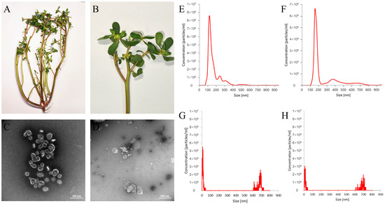 Morphological identification of Portulaca oleracea L. and characterization of PELNs: (A) habit of the whole plant, (B) close-up view, (C,D) TEM structural diagram of D-PELNs and F-PELNs, (E,F) particle size distribution diagram of D-PELNs and F-PELNs determined by NTA, and (G,H) particle size distribution diagram of D-PELNs and F-PELNs determined by NTA after treatment with 1% Triton X-100.