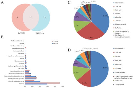 Non-targeted metabolomics analysis identified 273 metabolites in D-PELNs and 262 metabolites in F-PELNs. A Venn diagram showed that 94.87% of the metabolites were common between both groups (Figure 2A). The core metabolites in both D-PELNs and F-PELNs were terpenoids (e.g., cesaldekarin e) and carboxylic acid derivatives (e.g., citric acid and malic acid). The metabolite classification distributions for D-PELNs and F-PELNs are depicted in Figure 2B. The top 10 metabolite distribution profiles (Figure 2C,D) showed that caesaldekarin e and citric acid were the two most abundant metabolites in both D-PELNs and F-PELNs. The top five components in D-PELNs were caesaldekarin e (24.84%), citric acid (18.98%), malic acid (7.41%), fructose (6.07%), and adenosine (2.73%), whereas, the top five metabolites in F-PELNs were caesaldekarin e (40.93%), citric acid (11.41%), fructose (11.34%), malic acid (5.09%), and adenosine (4.85%).