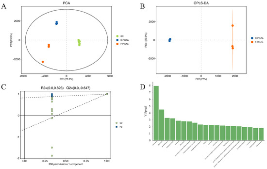 Multivariate Statistical Analysis of D-PELNs and F-PELNs: (A) PCA plots of bioactive compounds, (B) OPLS-DA plots of bioactive compounds, (C) 200-permutation validation plot for OPLS-DA model, (D) screening of Top 20 bioactive compounds based on VIP > 1.