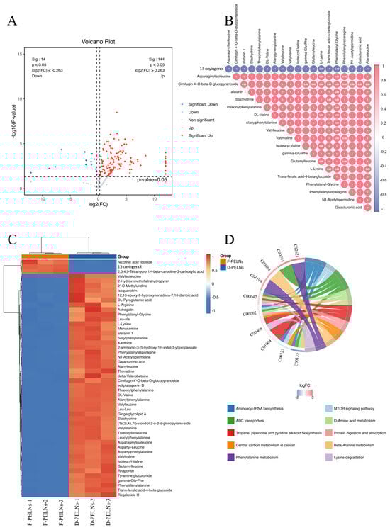 Screening differential metabolites between D-PELNs and F-PELNs: (A) volcano plots of differential metabolites, (B) correlation analysis of differential metabolites, (C) heatmap of differential metabolites, (D) KEGG enrichment analysis and chord diagram of differential metabolites.