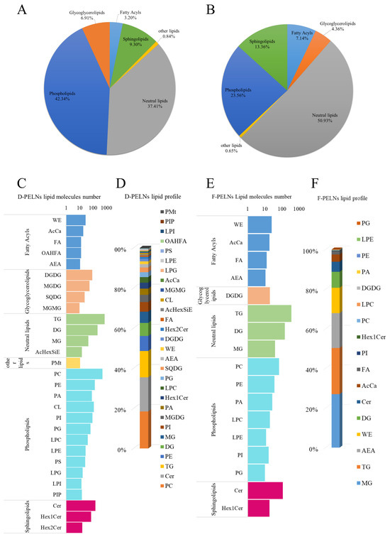 Analysis of lipid composition of D-PELNs and F-PELNs using lipidomics: (A) lipid composition classification in D-PELNs, (B) lipid composition classification in F-PELNs, (C) number distribution of lipid components in D-PELNs, (D) content distribution of lipid components in D-PELNs, (E) number distribution of lipid components in F-PELNs, (F) content distribution of lipid components in F-PELNs.
