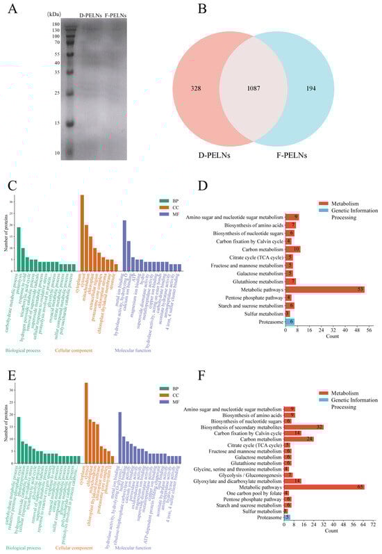 Analysis of the protein composition and function of D-PELNs and F-PELNs: (A) total protein analysis of D-PELNs and F-PELNs using SDS-PAGE, (B) Venn diagram of total proteins in D-PELNs and F-PELNs using proteomics, (C) GO function analysis of D-PELN proteins, (D) KEGG function analysis of D-PELN proteins, (E) GO function analysis of F-PELN proteins, (F) KEGG function analysis of F-PELN proteins.