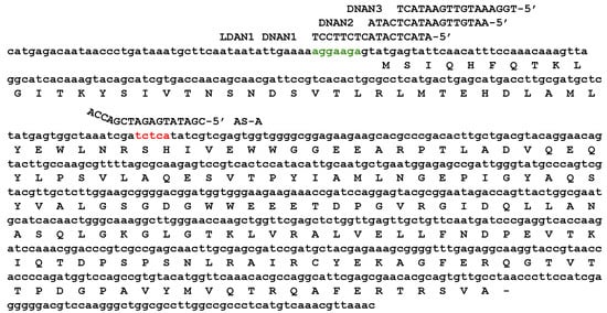 Nucleotide sequences of the aac(6′)-Ib mRNA and antisense oligomers. Complete sequence of the coding strand corresponding to the mRNA used in this work showing the AAC(6′)-Ib amino acid sequence, the Shine-Dalgarno (green), and the region A, accessible to interact with antisense oligomers (red) as described in Sarno et al. [32]. AS-A, general nucleotide sequence of oligomers used in this study.