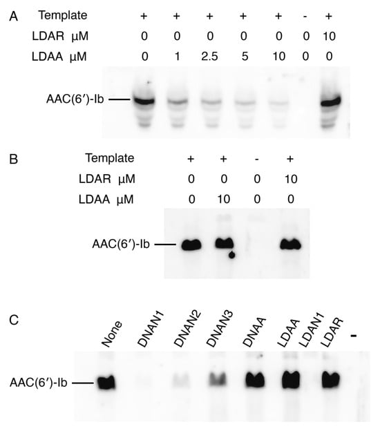 Inhibition of aac(6′)-Ib expression. In all cases, the template was plasmid pAMND201 DNA, which carries the aac(6′)-Ib gene. Reactions were carried out as described in Section 4 and the protein was detected by western immunoblot. (A) Coupled transcription–translation reactions using cell lysates in the presence of increasing concentrations of LDAA. Control reactions were carried out with no antisense (leftmost lane), with addition of LDAR, a gapmer with a random sequence (rightmost lane), or without template and antisense oligomers (next to the rightmost lane). (B,C) Coupled transcription–translation reactions using a reconstituted system lacking RNase H and RNase P. (B) the experimental reaction is shown in second from left lane, control lanes are reactions lacking antisense (leftmost lane), template and antisense second lane from the rightmost), or with the addition of LDAR (rightmost lane). (C) reactions performed in the presence of various antisense molecules (10 μM), as indicated above each lane. The rightmost lane corresponds to a reaction where addition of template and antisense were omitted.