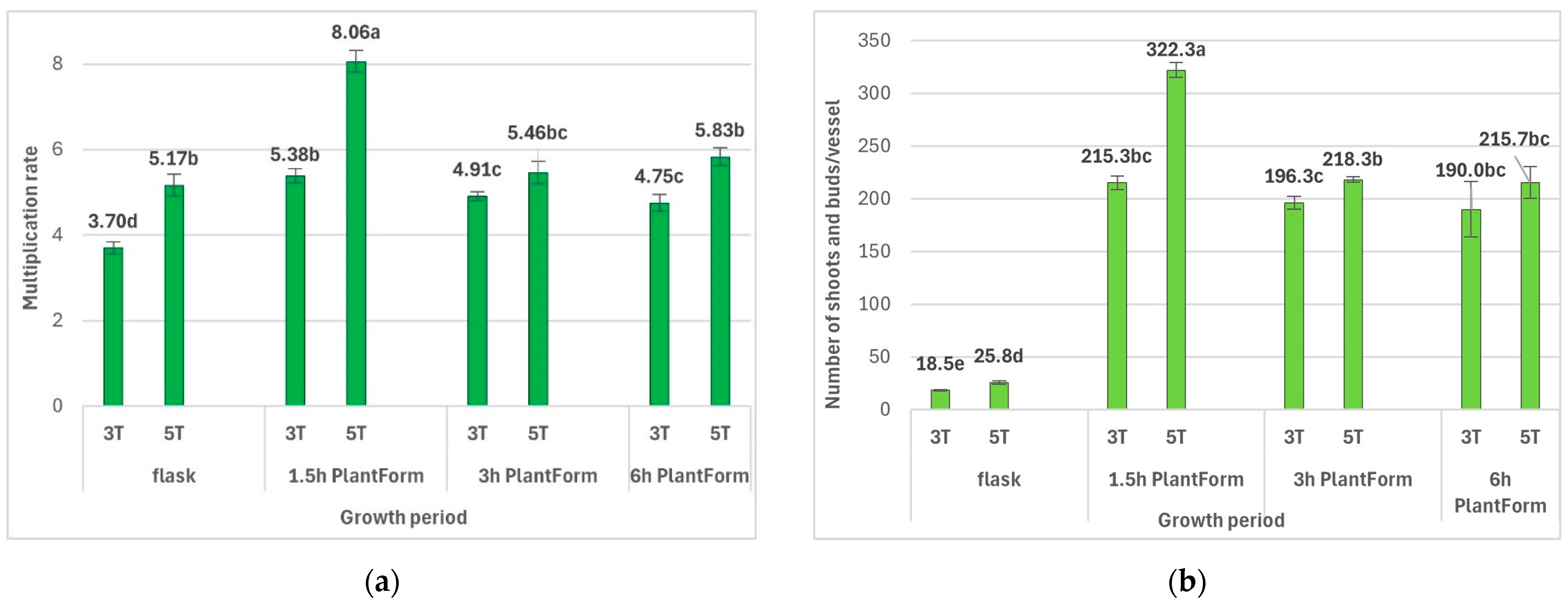 - Reyes-Beristain, B.; Mancilla-Álvarez, E.; López-Buenfil, J.A.; Bello-Bello, J.J. Temporary immersion bioreactor for in vitro multiplication of raspberry (Rubus idaeus L.). Horticulturae 2025, 11, 842. [Google Scholar] [CrossRef]