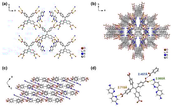 The H4TCPE and NH2Bpy linkers were purchased from commercial sources. Single crystals of FDU-HOF-21 can be obtained by mixing their methanol solutions with water followed by slow solvent evaporation at room temperature over 48 h (Figure 1). Single-crystal X-ray diffraction (SCXRD) analysis (Table S1) reveals FDU-HOF-21 in a monoclinic C2/c space group (unit cell parameters: a = 24.1153(18) Å, b = 18.1561(13) Å, c = 11.1232(7) Å, α = γ = 90°, β = 110.316(2)°), and the molecular formula was determined to be [H(NH2Bpy)]2(TPE) (C30H18O8, 2(C10H11N4)). As shown in Figure 2, in FDU-HOF-21, two oxygen atoms from each H4TCPE molecule forming N···H−O hydrogen bonds with nitrogen atoms of the amino groups on NH2Bpy ligands (2.960 Å), while two additional oxygen atoms establish O−H···N hydrogen bonds with pyridinic nitrogen atoms (2.715 Å). The H4TCPE frameworks are interconnected through intermolecular dimer (O−H···O, 2.457 Å) with adjacent units, forming a stable three-dimensional HOF. The above hydrogen bonds extend along the a- and b-axes, generating one-dimensional channels parallel to the c-axis direction. Notably, protonation occurs at nitrogen atoms of NH2Bpy ligands, which form charge-assisted hydrogen bonds (CAHBs) with carboxylate ions. The structural analysis of the material was performed by using the open source software tool Zeo++ (version 0.3) [50] (Figure S2 and Table S2). The accessible volume fraction of FDU-HOF-21 was determined to be 37.6% (accessible pore volume of 1718.73 Å3). The global cavity diameter (maximum included sphere diameters) is 3.713 Å, the pore limiting diameter (largest free sphere diameter) is 2.508 Å, and the largest cavity diameter is 3.706 Å. These results verified the porosity of FDU-HOF-21, establishing it as a porous HOF material.