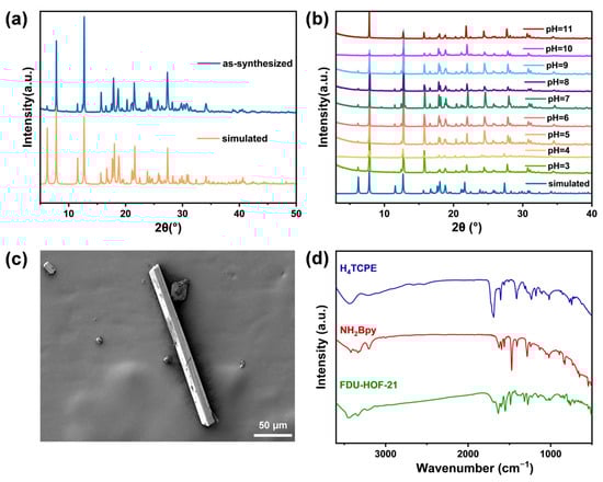(a) PXRD patterns of FDU-HOF-21; (b) PXRD patterns of FDU-HOF-21 after treatment with aqueous solutions at different pH; (c) SEM image of FDU-HOF-21; (d) FT-IR spectra of H4TCPE, NH2Bpy and FDU-HOF-21.