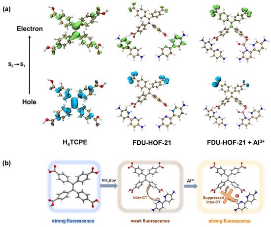 (a) TDDFT calculations and S0 → S1 electron–hole calculations for H4TCPE, FDU-HOF-21 and FDU-HOF-21+Al3+ (Color codes: electron, green; hole, blue); (b) proposed fluorescence mechanism for the formation of FDU-HOF-21 and its response to Al3+ ions.
