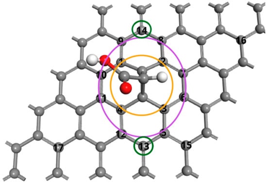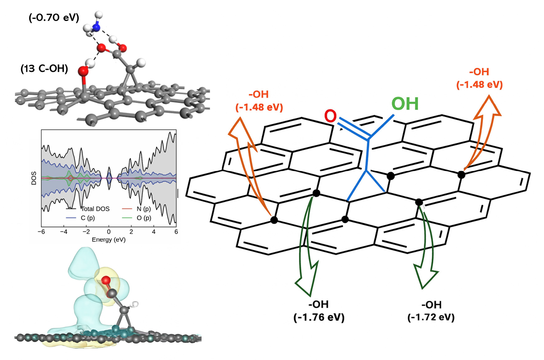 - Baachaoui, S.; Sementa, L.; Hajlaoui, R.; Aldulaijan, S.; Fortunelli, A.; Dhouib, A.; Raouafi, N. Tailoring Graphene Functionalization with Organic Residues for Selective Sensing of Nitrogenated Compounds: Structure and Transport Properties via QM Simulations. J. Phys. Chem. C 2023, 127, 15474–15485. [Google Scholar] [CrossRef]