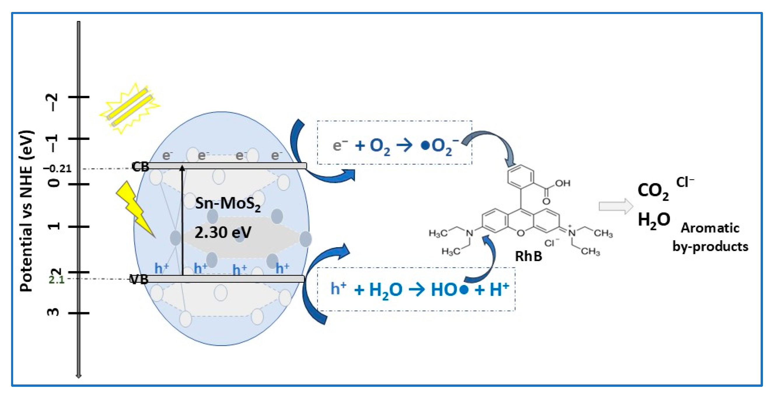 - Nandigana, P.; Mahato, S.; Dhandapani, M.; Pradhan, B.; Subramanian, B.; Panda, S.K. Lyophilized tin-doped MoS2 as an efficient photocatalyst for overall degradation of Rhodamine B dye. J. Alloys Compd. 2022, 907, 164470. [Google Scholar] [CrossRef]