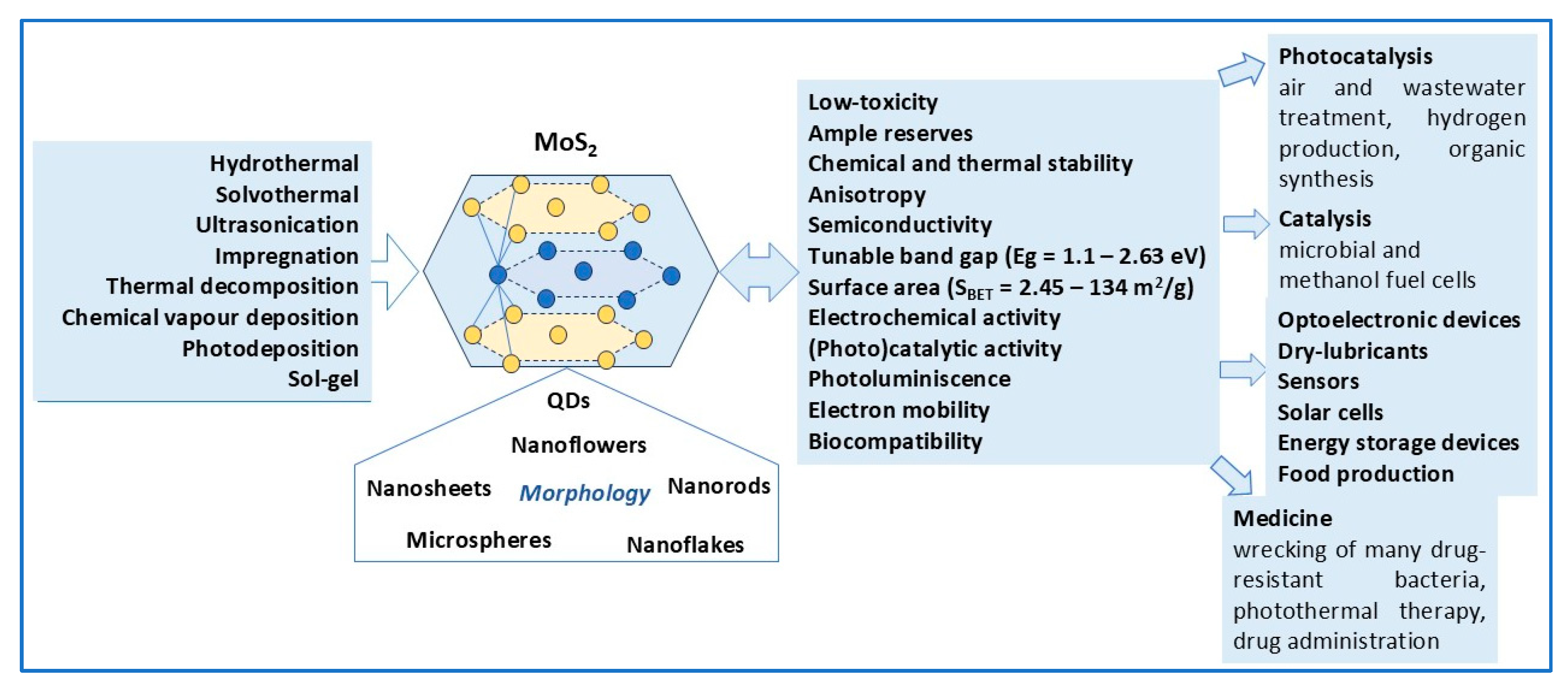 - Anushya, G.; Benjamin, M.; Sarika, R.; Pravin, J.C.; Sridevi, R.; Nirmal, D. A review on applications of molybdenum disulfide material: Recent developments. Micro Nanostructures 2024, 186, 207742. [Google Scholar] [CrossRef]