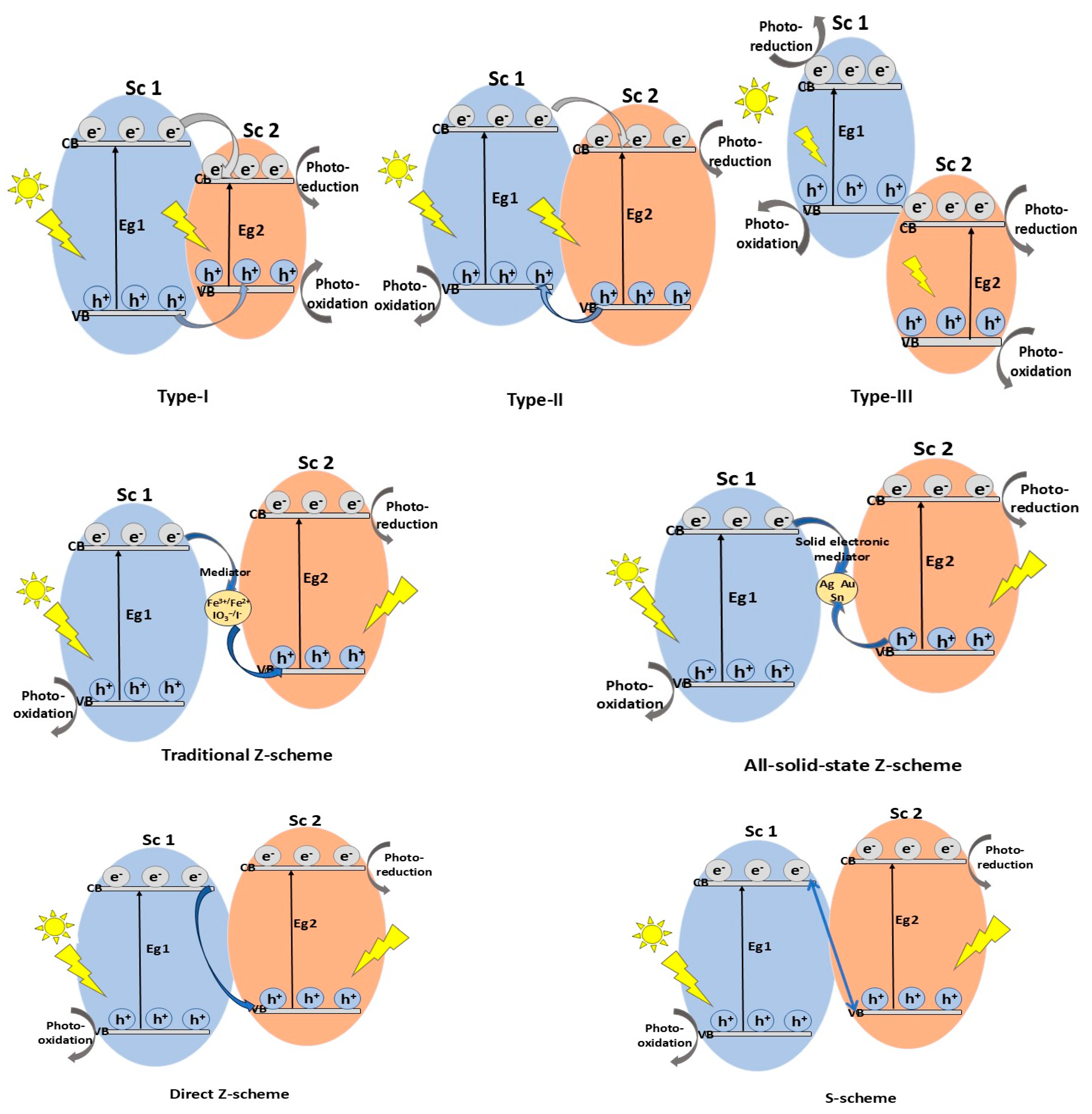 - Type-I heterojunction, with straddling bandgaps in which charge carriers transfer results in redox reactions occurring at the same semiconductor (Sc 2);