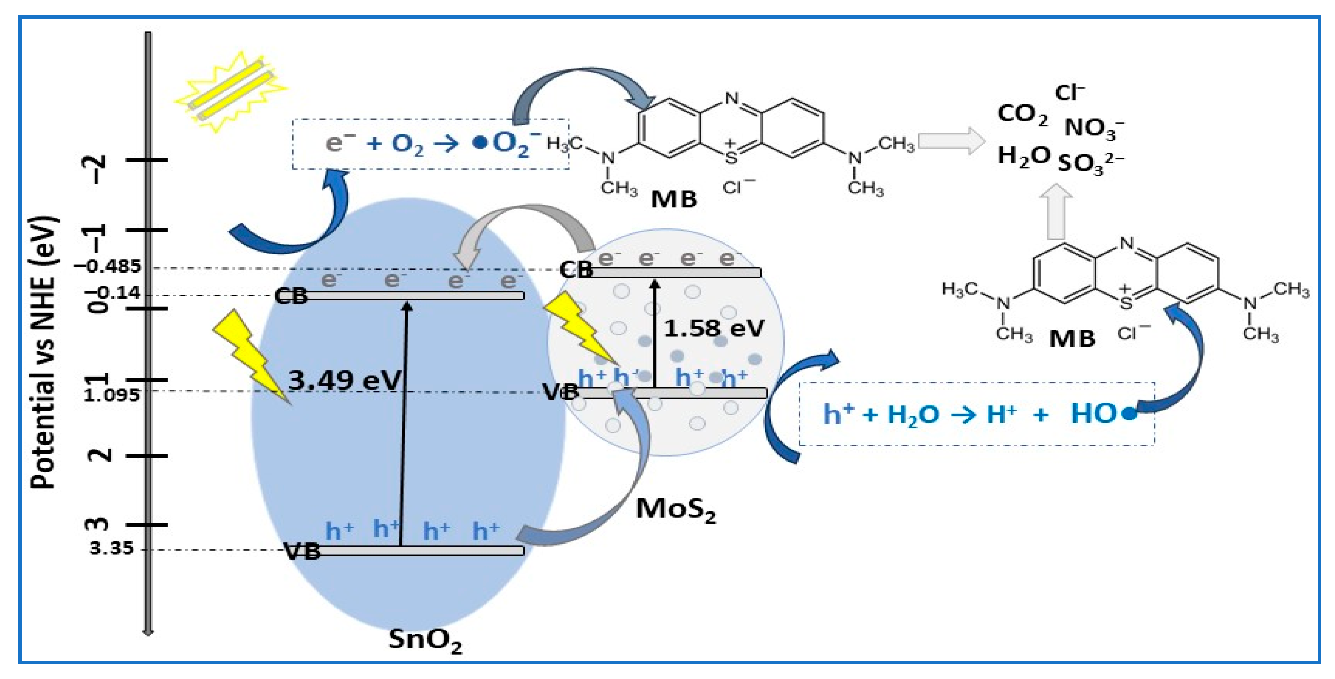 | MoS2/SnO2 | II | hydrothermal | MB (8) | 2 | VIS (150 W Xenon lamp) | 99.5 | 5 | [26] |