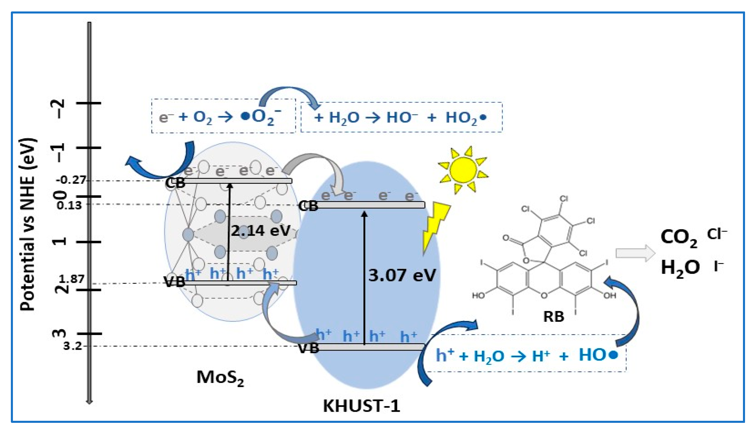 - Roy, S.; Darabdhara, I.; Ahmaruzzaman, M.d. MoS2 Nanosheets@Metal organic framework nanocomposite for enhanced visible light degradation and reduction of hazardous organic contaminants. J. Clean. Prod. 2023, 430, 139517. [Google Scholar] [CrossRef]
