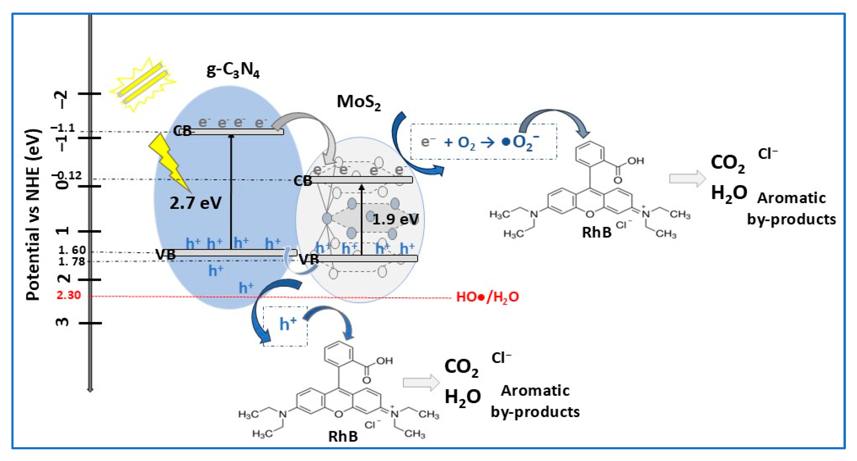 - Cui, Z.; Wu, H.; Bai, K.; Chen, X.; Li, E.; Shen, Y.; Wang, M. Fabrication of a g-C3N4/MoS2 photocatalyst for enhanced RhB degradation. Phys. E 2022, 144, 115361. [Google Scholar] [CrossRef]