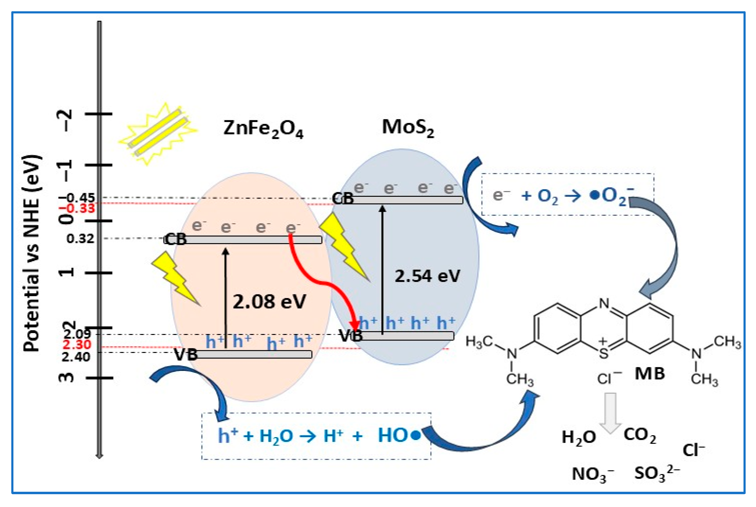 | MoS2/ZnFe2O4 | Z-scheme | hydrothermal | MB (10) | 0.1 | VIS (160 W tungsten-mercury lamp) | 92.3 | 150 | [80] |