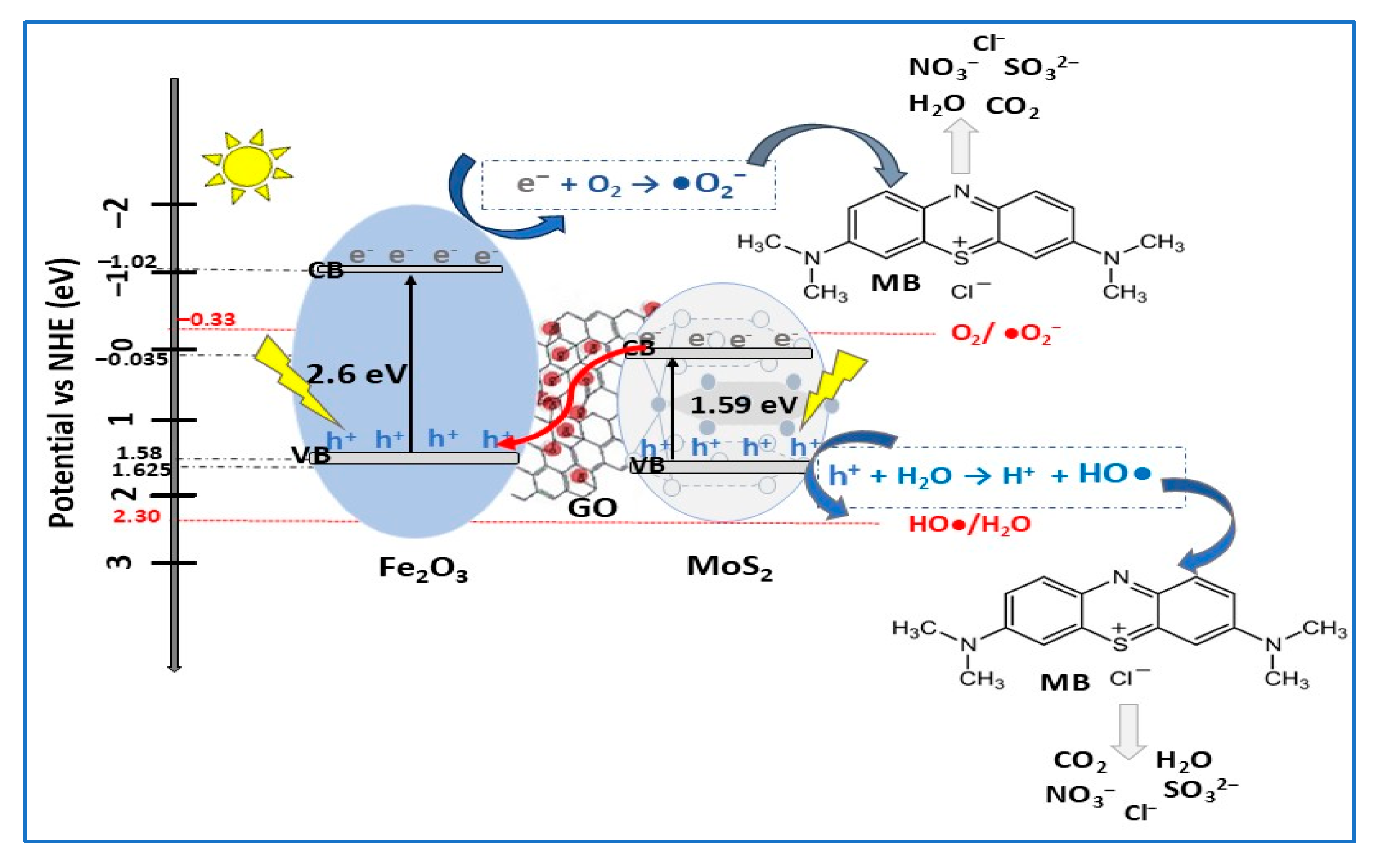- Samarasinghe, L.V.; Muthukumaran, S.; Baskaran, K. Magnetically recoverable MoS2/Fe2O3/graphene oxide ternary Z-scheme heterostructure photocatalyst for wastewater contaminant removal: Mechanism and performance. J. Environ. Chem. Eng. 2025, 13, 116813. [Google Scholar] [CrossRef]