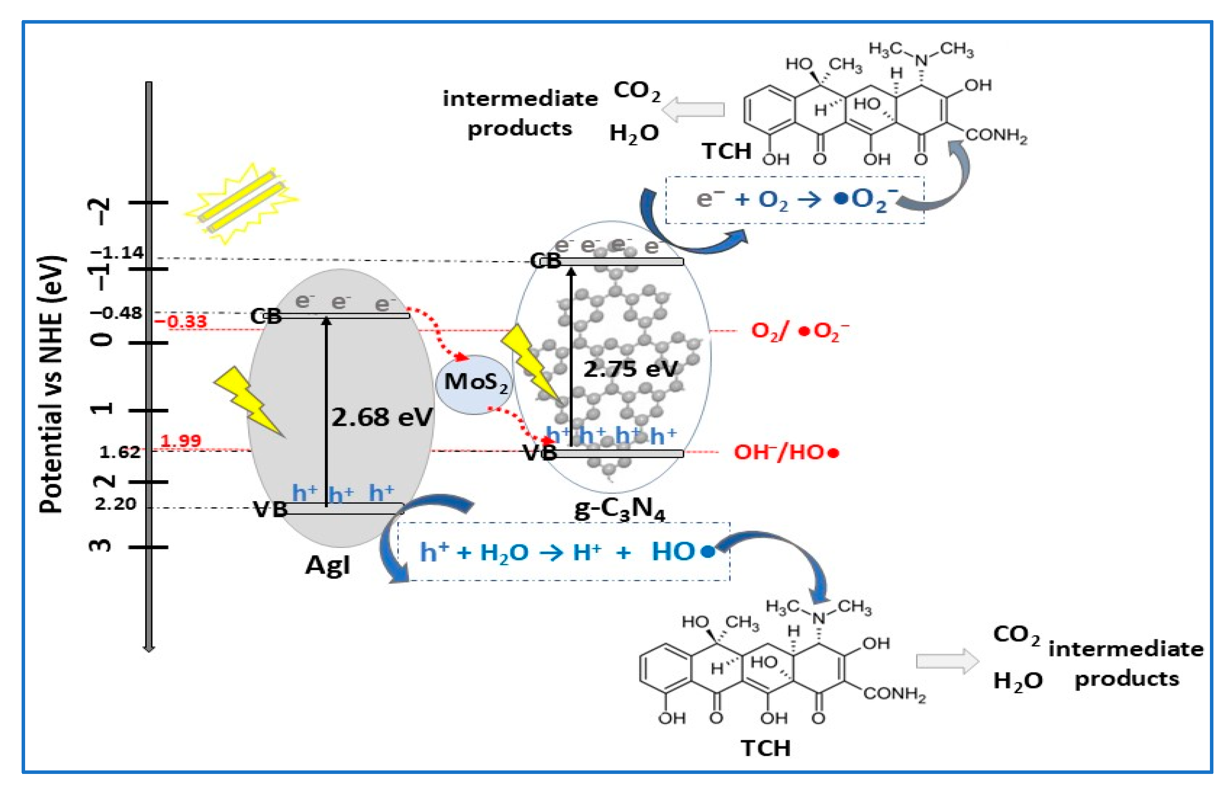 | AgI/MoS2/g-C3N4 | Z-scheme | solvothermal | TCH (10) | 0.5 | VIS (300 W Xe lamp) | 82.8 | 50 | [94] |