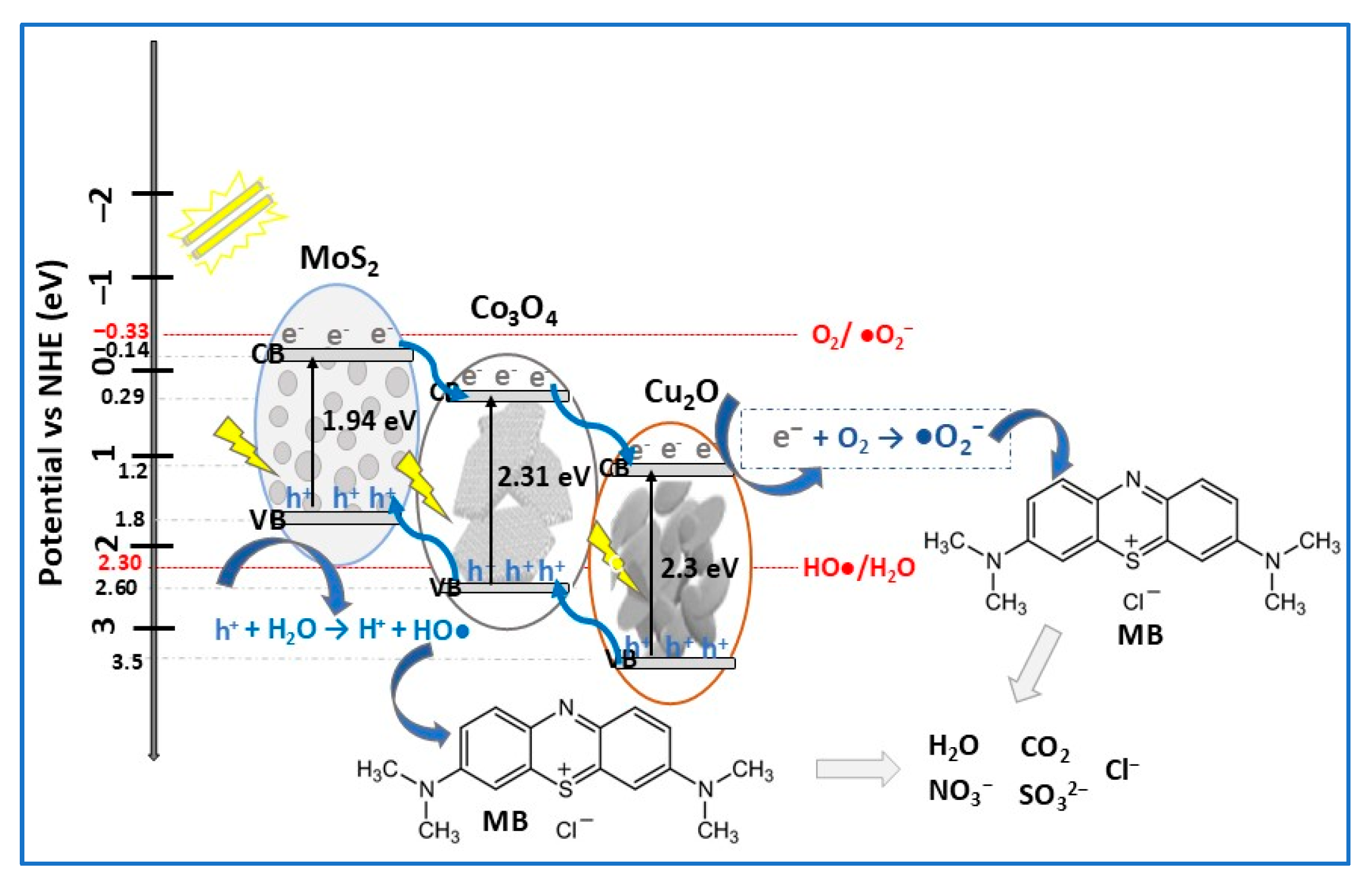 | MoS2/Co3O4/Cu2O | S-scheme | sonication + hydrothermal | MB (30) RhB (30) | 1 | VIS (500 W halogen lamp) | 91 92 | 100 90 | [97] |