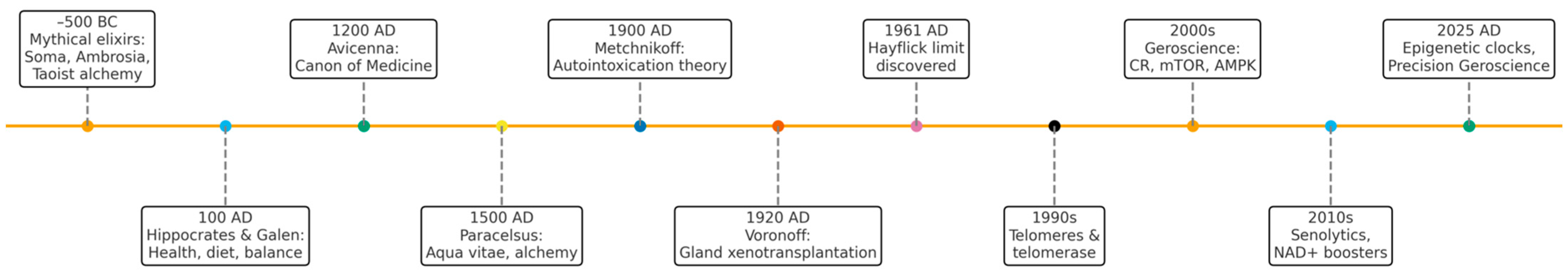 Chicago/Turabian StyleNicoletti, Giuseppe Rosario Pietro, Katia Mangano, Ferdinando Nicoletti, and Eugenio Cavalli. 2025. "From Elixirs to Geroscience: A Historical and Molecular Perspective on Anti-Aging Medicine" Molecules 30, no. 24: 4728. https://doi.org/10.3390/molecules30244728