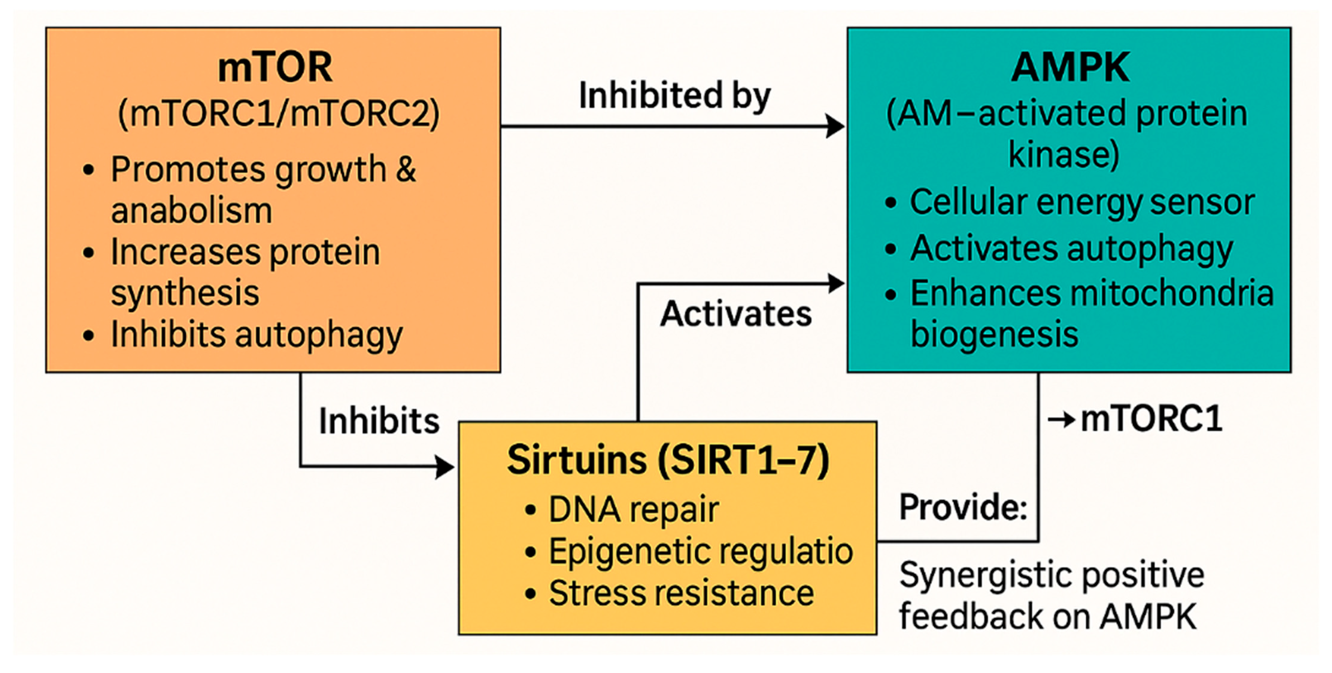 | AMPK (AMP-activated protein kinase) | Cellular energy sensor promoting catabolic pathways, enhancing autophagy and stress resistance. |