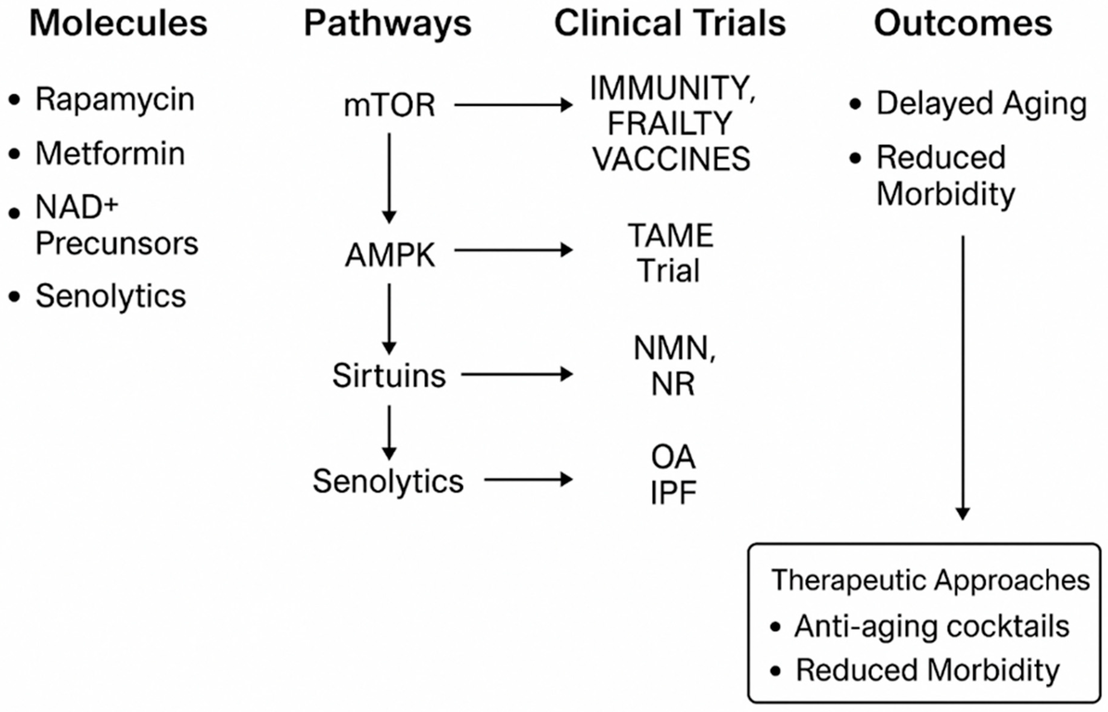 | NAD+ boosters (NR, NMN) | NCT06208527, NCT02921659, NCT04691986, NCT04407390 | NADage and others—frailty, NAD+ metabolism, muscle function (ongoing) | Early data suggest improved vascular/muscle function; modest overall effects. |
