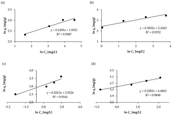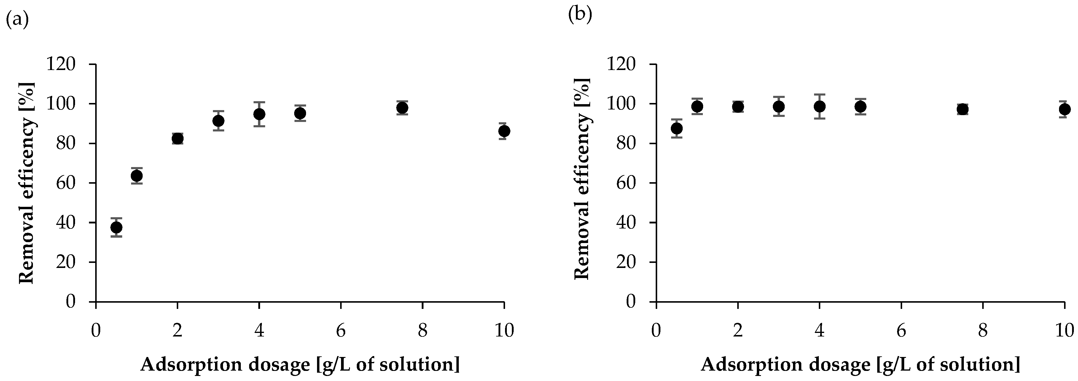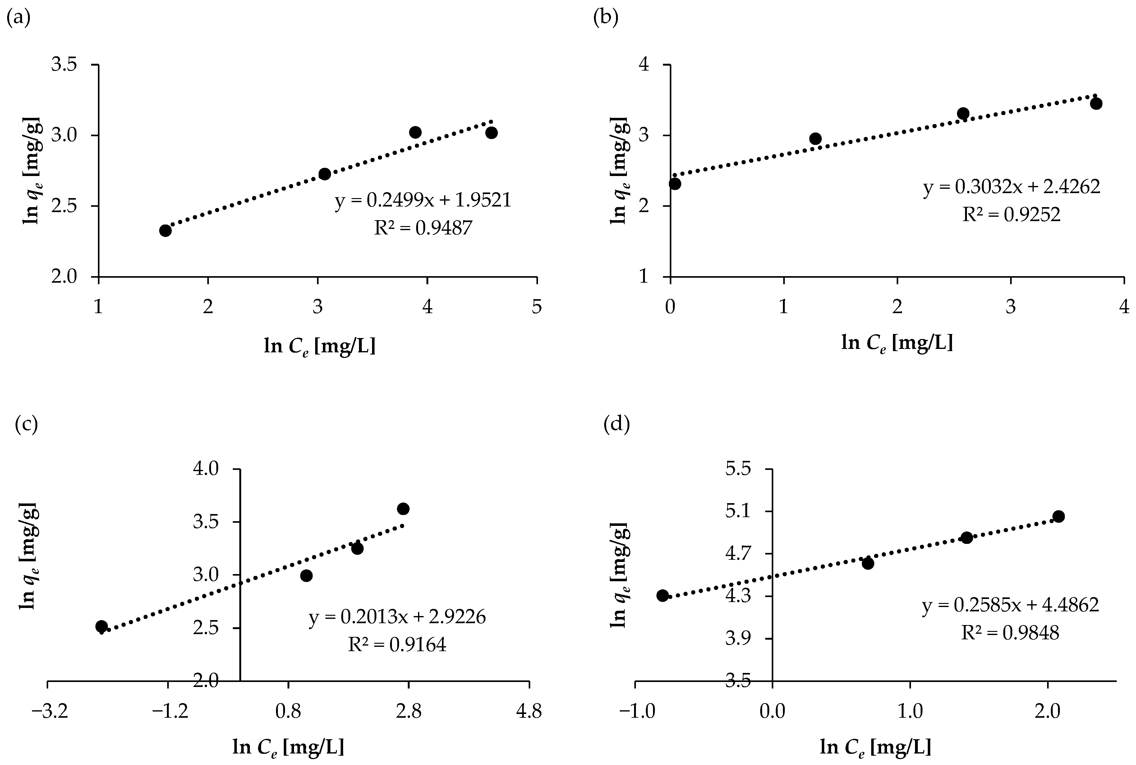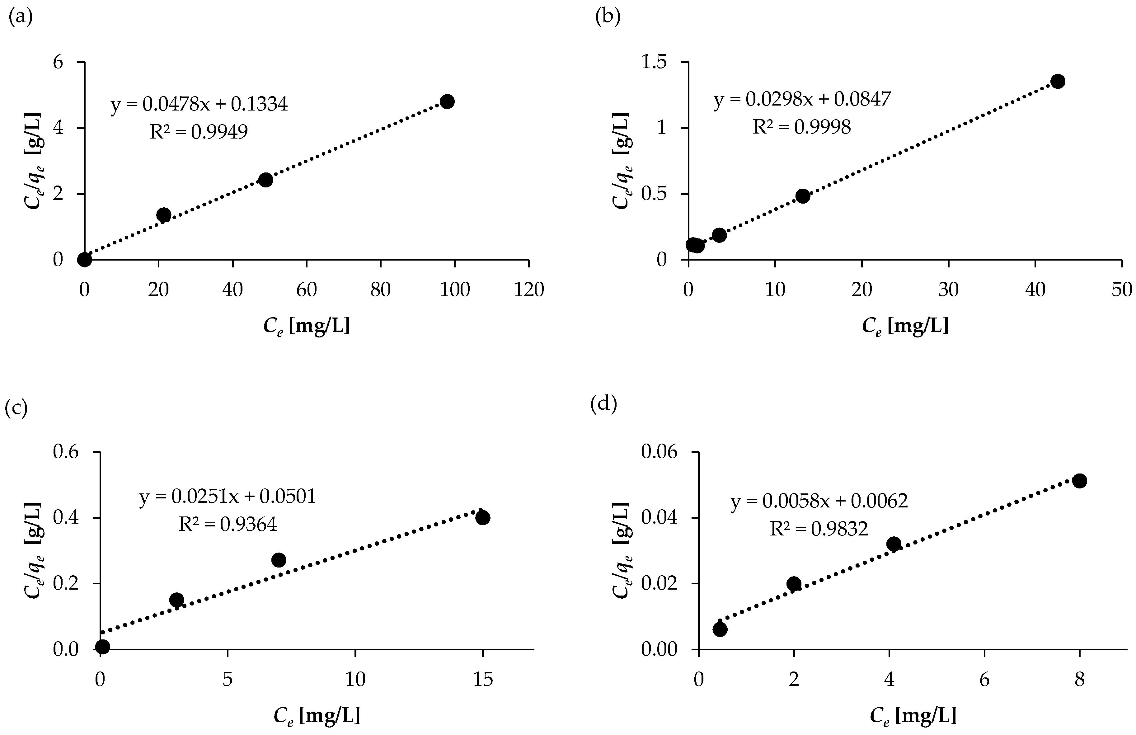 - Chung, H.K.; Kim, W.H.; Park, J.; Cho, J.; Jeong, T.Y.; Park, P.K. Application of Langmuir and Freundlich isotherms to predict adsorbate removal efficiency or required amount of adsorbent. J. Ind. Eng. Chem. 2015, 28, 241–246. [Google Scholar] [CrossRef]