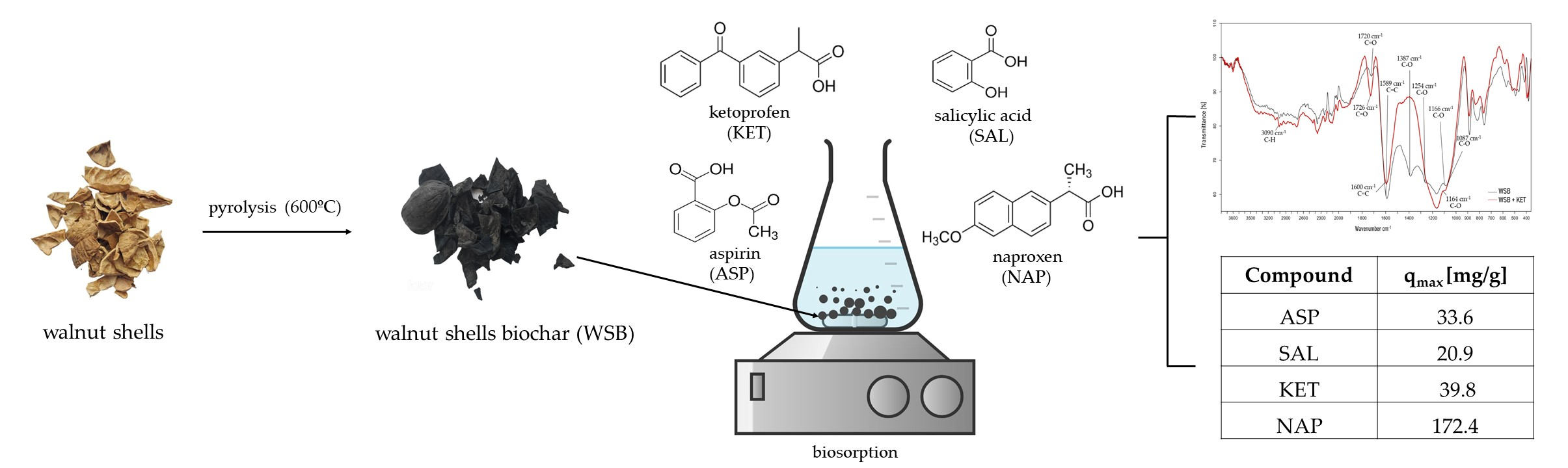 Narloch, I.; Wejnerowska, G.; Wojewódzki, P. Biosorption of Aspirin, Salicylic Acid, Ketoprofen, and Naproxen in Aqueous Solution by Walnut Shell Biochar: Characterization, Equilibrium, and Kinetic Studies. Molecules 2025, 30, 4731. https://doi.org/10.3390/molecules30244731