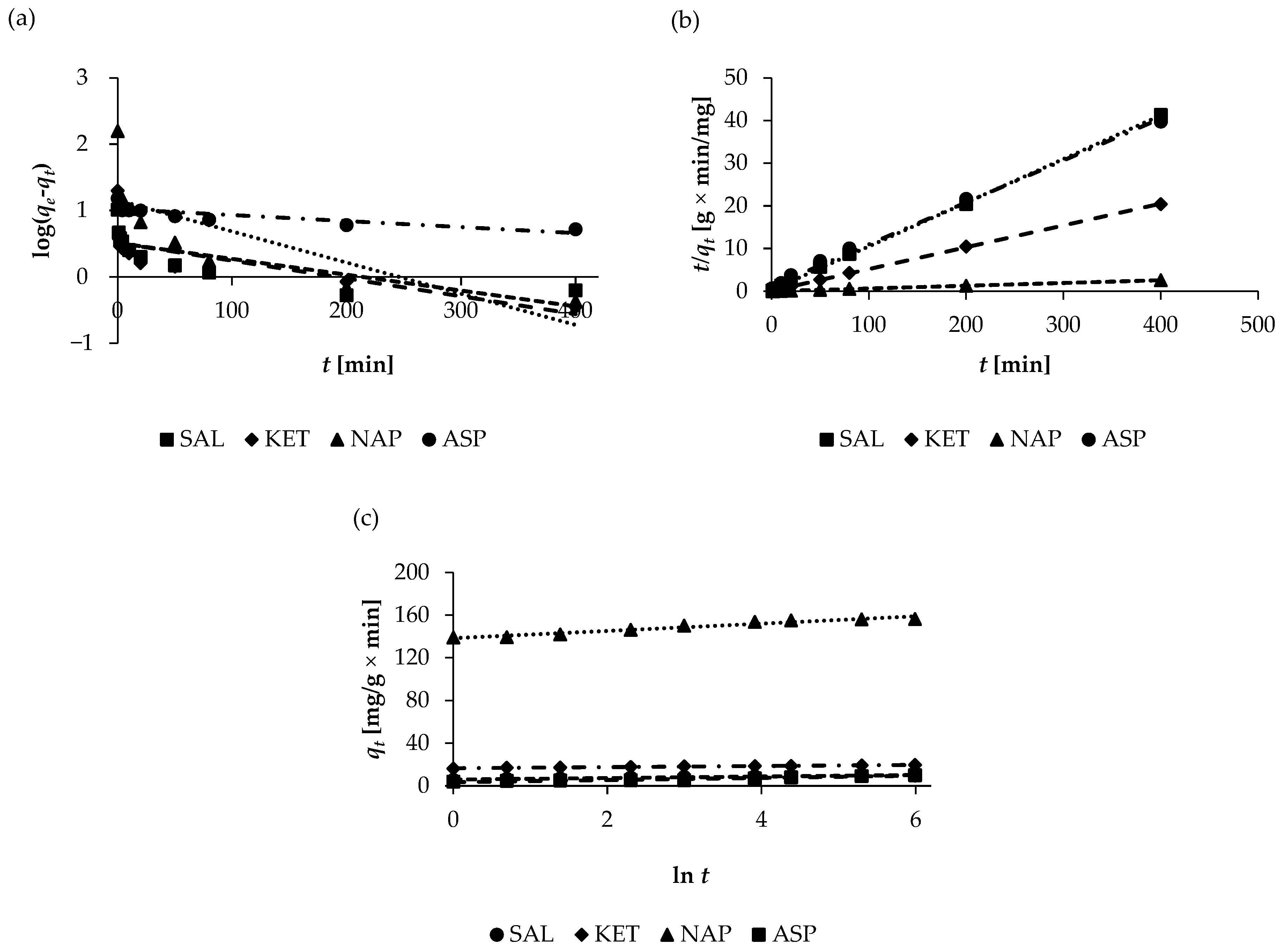 | Analyte | C0 [mg/L] | qe [mg/g] | Pseudo-First-Order | Pseudo-Second-Order | Elovich | ||||||