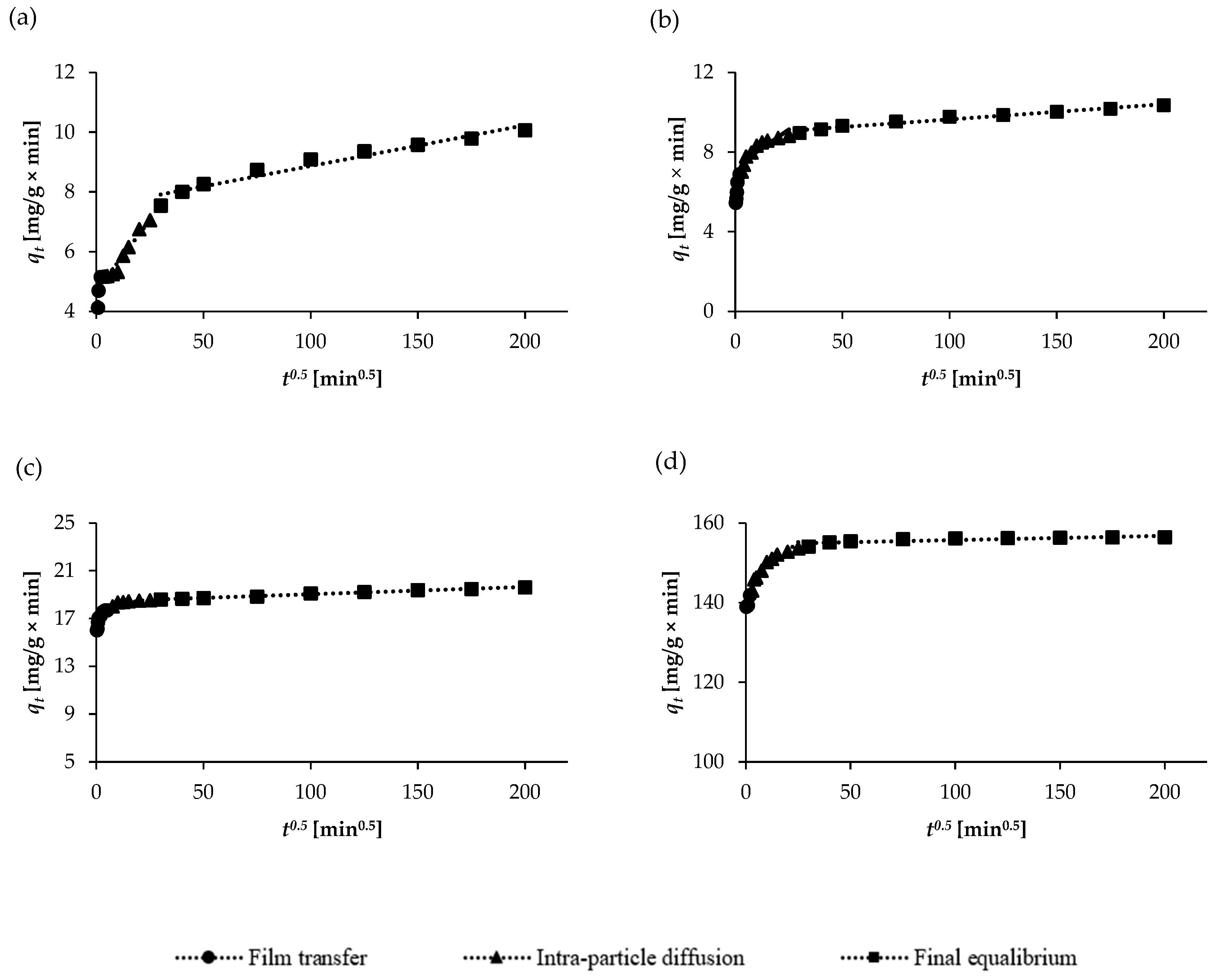 - Wang, J.; Guo, X. Rethinking of the intraparticle diffusion adsorption kinetics model: Interpretation, solving methods and applications. Chemosphere 2022, 309, 136732. [Google Scholar] [CrossRef]