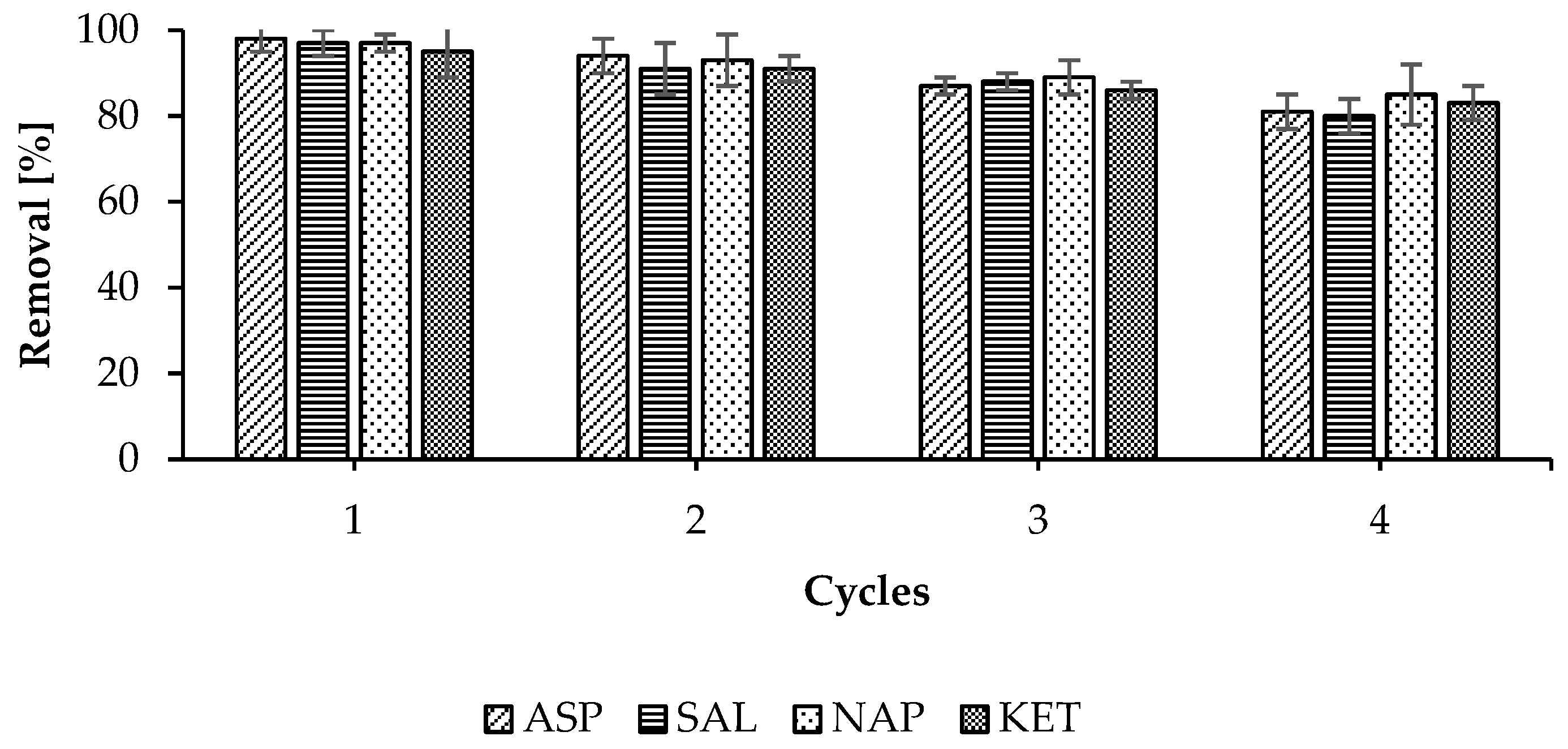- Romano, N.C.; Tentler Prola, L.D.; Passig, F.H.; Freire, F.B.; Ferreira, R.C.; Vinicius de Liz, M.; Querne de Carvalho, K. Thermal treated sugarcane bagasse for acetylsalicylic acid removal: Dynamic and equilibrium studies, cycles of reuse and mechanisms. Int. J. Environ. Anal. Chem. 2022, 104, 5803–5819. [Google Scholar] [CrossRef]