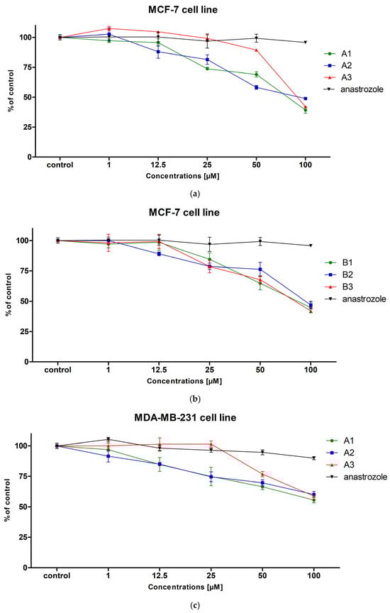 In the case of MCF-7 cells, all tested compounds showed cytotoxic activity in a concentration-dependent manner (Figure 1a,b). The strongest antitumor activity among all tested compounds was observed for compound A2 (IC50 = 52.35 µM), as well as for compounds A3 (IC50 = 54.81 µM), B1 (IC50 = 53.9 µM) and B3 (IC50 = 54.1 µM), which indicates their comparable efficacy against this breast cancer cell line. Compound A1 showed slightly weaker activity (IC50 = 65.95 µM), while compound B2 was characterized by the lowest activity in this group (IC50 = 82.48 µM). All compounds tested showed lower IC50 values (were more toxic) than anastrozole (IC50 > 100 µM).
