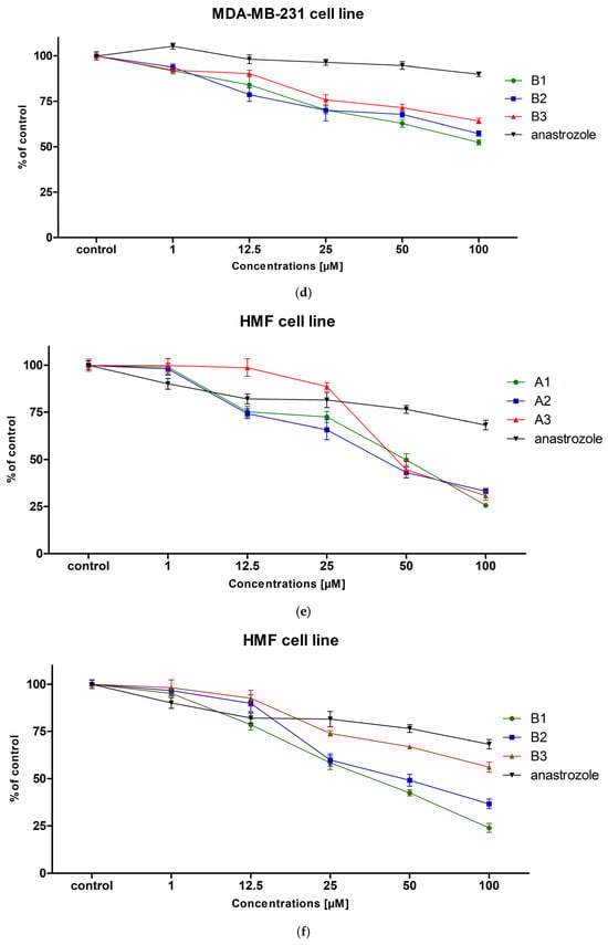 The viability of MCF-7 (a,b), MDA-MB-231 (c,d) and HMF (e,f) cells exposed to different concentrations of the tested compounds (A1–A3, B1–B3) for 24 h. Mean values ± SD from two independent experiments performed in quadruplicate are presented.