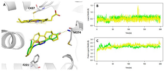 Binding mode of compound B3 (green) in the active site of the aromatase enzyme. For comparison, the binding position and orientation of the co-crystallized inhibitor (yellow) are also shown (A). Panels (B,C) present the RMSD trajectories calculated from 200 ns long MD simulations for B3 and the native inhibitor (B), as well as for their respective enzyme–ligand complexes (C).
