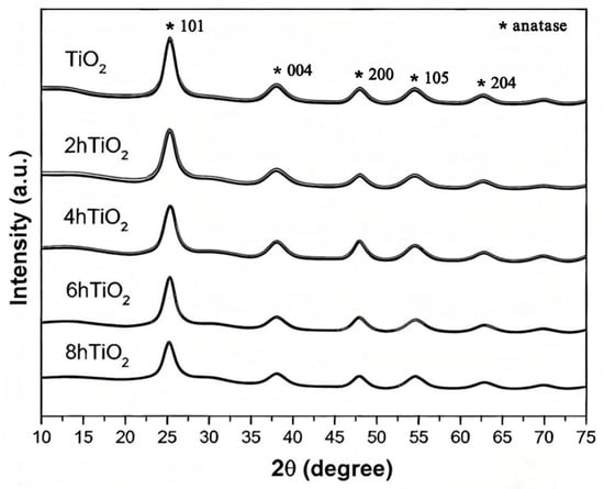 Figure 2 shows the X-ray diffraction (XRD) patterns of TiO2, 2hTiO2, 4hTiO2, 6hTiO2, and 8hTiO2. The mesoporous TiO2 Nanospheres exhibit characteristic diffraction peaks at 2θ values of 25.5°, 37.9°, 48.2°, 54.1°, and 63.1°, corresponding to the typical anatase phase of TiO2. Which correspond to the typical anatase phase of TiO2. Specifically, the primary peaks at 25.5° (101), 37.9° (004), and 48.2° (200), along with the secondary peaks at 54.1° (105) and 63.1° (204), confirm the presence of anatase TiO2 in all treated samples. These findings indicate that the treatment did not induce a phase transition, but rather affected the degree of crystallization, which influences the photocatalytic properties [34]. The XRD patterns of the treated samples (2hTiO2, 4hTiO2, 6hTiO2, and 8hTiO2) show diffraction peaks that are consistent with the TiO2 anatase phase, with no significant phase transformation observed.