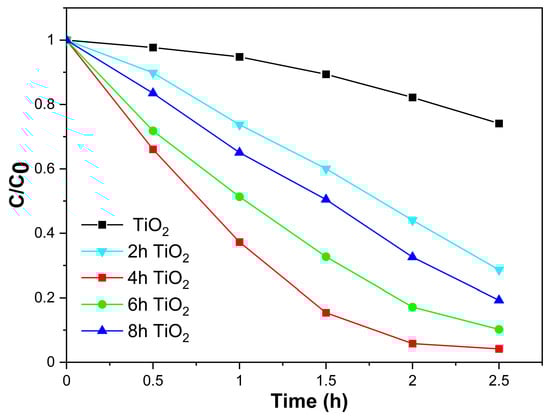 The photocatalytic activity of TiO2, 2hTiO2, 4hTiO2, 6hTiO2, and 8hTiO2 was evaluated by simulating sunlight using a xenon lamp, optical filters, and a condenser, with Rhodamine B (RHB) degradation as the test reaction. Figure 4 presents the degradation results for these samples over a 2.5 h period. The degradation rates of TiO2, 2hTiO2, 4hTiO2, 6hTiO2, and 8hTiO2 were 25.9%, 71.4%, 95.8%, 89.8%, and 80.7%, respectively. Notably, the 4hTiO2 sample exhibited the highest photocatalytic activity, with a degradation rate of approximately 95%, indicating its superior performance compared to the other samples.