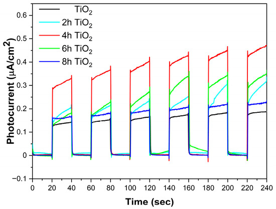 Photocurrent of TiO2, 2h TiO2,4h TiO2,6h TiO2 and 8h TiO2 under visible light (>400 nm) on/off cycles.