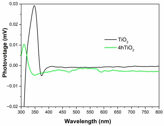 Figure 6 shows the surface photovoltage (SPV) spectra for TiO2 and 4hTiO2. The SPV response of TiO2 Nanospheres is observed in the 300–380 nm range, while 4hTiO2 exhibits a response across the entire spectrum. This broadening of the SPV response range in 4hTiO2 can be attributed to the vacuum high-temperature treatment, which likely enhances the surface properties and promotes more effective charge separation.