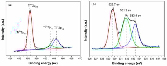 Figure 7 shows the Ti 2p (a) and O 1s (b) X-ray photoelectron spectroscopy (XPS) spectra of the 4hTiO2 sample. The Ti 2p binding energies for pure TiO2 are typically observed around 464.5 eV and 459.0 eV [36]. However, in the 4hTiO2 sample, the presence of Ti3+ results in a shift in the binding energies to lower values [37]. The Ti 2p peak is complex, with four sub-peaks corresponding to Ti3+ 2p3/2 at approximately 456.8 eV, Ti4+ 2p3/2 at around 458.5 eV, Ti3+ 2p1/2 at approximately 463.2 eV, and Ti4+ 2p1/2 at around 464.5 eV [38,39]. As shown in Figure 7a, the intensity of the Ti3+ peak is relatively weak, indicating that the concentration of Ti3+ in the 4hTiO2 sample is low.