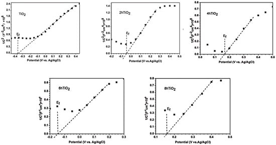 The flat band potential of a semiconductor can be determined from the Mott-Schottky plot, which reveals the type of semiconductor behavior. A positive slope in the Mott-Schottky curve indicates that the material is an n-type semiconductor, while a negative slope suggests it is a p-type semiconductor. Figure 8 presents the Mott-Schottky plots for TiO2, 2hTiO2, 4hTiO2, 6hTiO2, and 8hTiO2. According to the Mott-Schottky equation: