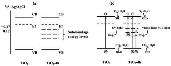 Furthermore, based on the Mott-Schottky theory, the flat band potentials (approximately equal to the Fermi level) for TiO2, 2hTiO2, 4hTiO2, 6hTiO2, and 8hTiO2 were approximately −0.37 V, −0.04 V, 0.17 V, −0.15 V, and 0.16 V vs. Ag/AgCl, respectively. These values demonstrate that the flat band potential shifts with the treatment time, which may be linked to changes in the electronic structure or the formation of surface defects during the vacuum treatment. The variation in the flat band potential suggests modifications in the electron density and electronic properties of the material, which can influence its photocatalytic performance. Based on the above results, the band structure of brown TiO2 can be qualitatively analyzed, as illustrated in Figure 9. After high-temperature vacuum treatment, the samples exhibit a lower Fermi level, indicating the formation of a greater number of sub-bandgap energy levels located deeper within the forbidden band between the valence band and the conduction band. Under visible-light irradiation, electrons can be excited from the valence band to these empty sub-bandgap states, or further promoted from these states to the conduction band, thereby generating photogenerated holes and reactive radicals that participate in the oxidation of RhB. This mechanism is consistent with the broad absorption band observed between 400 and 800 nm in the UV–vis absorption spectra. The detailed nature and internal structure of these sub-bandgap energy levels may be further elucidated in future work by first-principles calculations.
