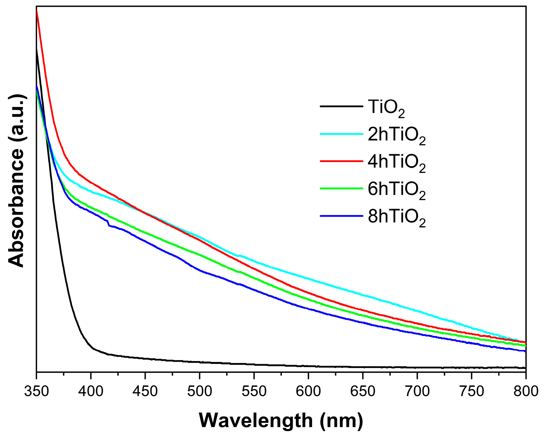 2) demonstrates an increase in absorption starting at 800 nm, indicating that these samples can absorb light in the visible light region. This shift toward longer wavelengths, known as a redshift, suggests that the treatment extends the light absorption range of TiO